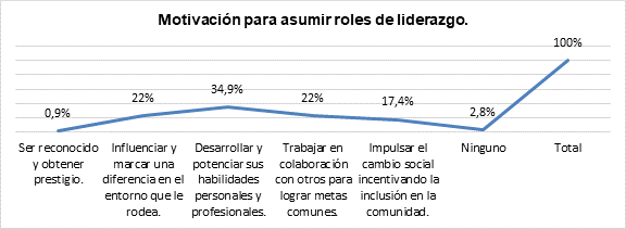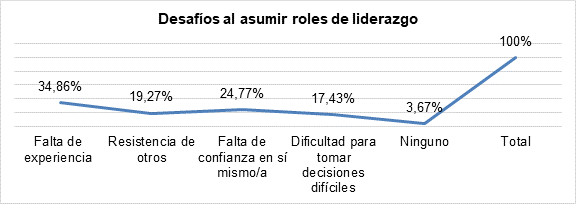 Con respecto a esta pregunta sobre los desaf os que puede tener el encuestado al momento de asumir el rol de liderazgo, se observa que el 34,86% dan nfasis a la falta de experiencia, lo que puede generar incertidumbre y dificultades al enfrentar nuevas responsabilidades; el 24,77% representa a la falta de confianza en s mismo/a que puede limitar la capacidad para influir y motivar a su equipo, un 19,27% es la resistencia de otros que puede dificultar la implementaci n de nuevas ideas, el 17,43% dan lugar a la dificultas de tomar decisiones dif ciles y 3,67% especifica que no hay desaf os; a partir de esto, se toma en consideraci n que el liderazgo puede poseer ciertas dificultades para no ser practicada, como se ala Carmona et al. (2021) la juventud cuenta con diversas iniciativas para desempe ar su papel de liderazgo, pero no hay elementos formativos que lo potencialice, es as como prevalece la falta de experiencia por adversidades y limitaciones de un ambiente activo, por lo que estos desaf os pueden requerir desarrollo personal, adquisici n de habilidades y el apoyo de mentores o programas de liderazgo para superarlos.
