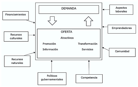 Este modelo muestra cómo la oferta y la demanda turística están en constante interacción y cómo diversos factores externos inciden en ambos, afectando la dinámica del sistema turístico en su conjunto.