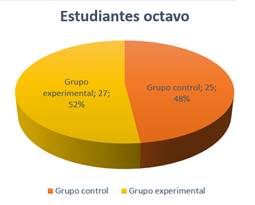 El grupo control un curso de octavo de 25 estudiantes que continuarán con clase inversa y para el grupo experimental un curso de octavo de 27 estudiantes que se empleará la estrategia de gamificación.
