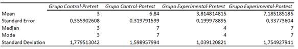El incremento de la media en el grupo experimental de 3,81 a 7,18 indica que una mejora en el rendimiento; el error standard es bajo en ambos casos lo que demuestra datos consistentes; la mediana en el grupo de control aumenta de 3 a 7 y del grupo de experimental de 4 a 7 lo que significa que ambos grupos mejoraron en calificaciones; el 7 es la calificación común en ambos grupos y la desviación standard mide la dispersión de los datos en torno a la media, a pesar que en grupo de experimental aumenta de 1,04 a 1,75 en la prueba final, sigue mostrando mejor promedio. En conclusión ambos grupos mejoraron pero mayor impacto tuvo el grupo experimental.