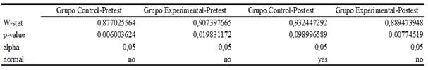 En los tres grupos el valor p es menor a 0,05 lo que indica que los datos no presentan una distribución normal y el grupo control-prueba final el valor p es mayor a 0,05 lo que indica que tiene una distribución normal. Pero aplicó pruebas no paramétricas para comparar los grupos para obtener resultados confiables.