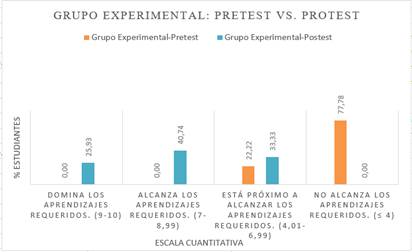 De 4,01-6,99 es "Está próximo a alcanzar los aprendizajes requeridos " y calificaciones de ≤ 4.00 indican "No alcanzan los aprendizajes requeridos". En la Figura 4 se puede ver las calificaciones del grupo experimental antes y después de aplicar la gamificación.