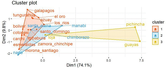 Por otro lado, los ejes Dimm 1 (74.10%) y Dimm 2 (9.80%) capturan el 83.90% de la variabilidad de los datos, lo que indica que estos dos componentes resumen de manera efectiva la estructura del clúster. Guayas y Pichincha presentan un comportamiento diferenciado respecto al resto de las provincias, lo que sugiere que ambas se distinguen en términos de indicadores sociales y económicos. El clúster 1 agrupa economías homogéneas en cuanto a producción y acceso al crédito, mientras que Guayas se caracteriza por su industrialización y Pichincha por su alta empleabilidad en el sector público, dado que en esta provincia se encuentra la capital, Quito.