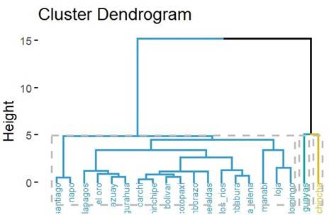 Diferentes resultados se ofrecen en el Análisis de Clustering Jeráquico, en la tabla # 1 se observa la clasificación de los 3 grupos de clústeres con sus respectivas provincias. Donde en el primer clúster captura la mayor parte de las provincias del Ecuador, dejando a las provincias más representativas del país con clústeres independientes cada uno.