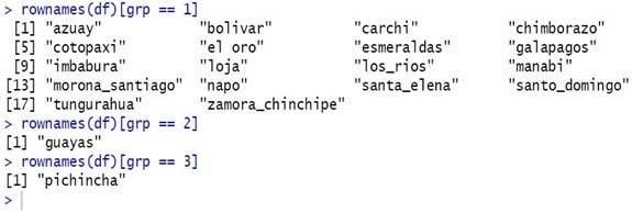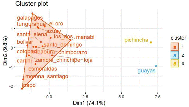 En el clúster 3 (color amarillo) se encuentra representado Pichincha, al encontrarse también alejado comparte similitudes con Guayas, pero de manera paralela presenta diferencias