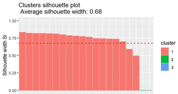 El gráfico evalúa la calidad del clúster jerárquico, el objetivo es medir las distancias, en otras palabras, que tan bien separadas o cohesionadas están las observaciones con respecto a los clústeres, como se observa en el gráfico el promedio es 0.68, es un indicador de un buen rendimiento, considere las provincias del primer clúster se encuentran cercano a 1, eso indica que las observaciones están bien agrupadas dentro del clúster. Además, los clústeres 1 y 2 tienen valores de silueta bajos, entonces pueden no estar bien definidos.