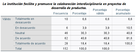 La primera tabla muestra la percepción de los encuestados sobre el apoyo institucional a la colaboración interdisciplinaria en proyectos de desarrollo de productos. Los resultados indican que una mayoría significativa de los encuestados tiene una opinión favorable respecto al apoyo de la institución para promover dicha colaboración: