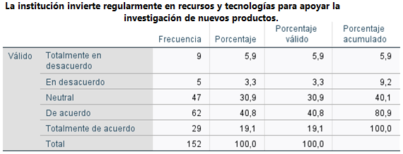En la segunda tabla, se evalúa la percepción de la inversión de la institución en recursos y tecnologías para apoyar la investigación de nuevos productos. Los resultados reflejan una tendencia similar a la colaboración interdisciplinaria: