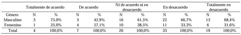 Para el análisis de los datos, se evaluaron los supuestos de normalidad, resultando en un valor de p = 0.005. Este resultado indica que la distribución no es normal, lo que justificó la aplicación de pruebas no paramétricas para detectar diferencias significativas. Además, se utilizaron tablas de contingencia para analizar las variables de género en las preguntas que mostraron alta significancia.