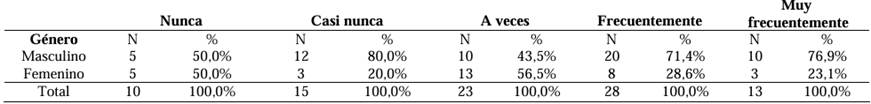 La pronunciación de letras específicas como "c", "s" y "z", características del acento montuvio, permite a individuos de otras culturas o regiones distinguir a los hablantes por su sonido particular. En este contexto, se analizó las percepciones de género relacionadas con la pronunciación de estas letras, según lo indicado en la Tabla 4. Los resultados muestran que tanto hombres como mujeres creen que nunca pronuncian estas letras correctamente. Sin embargo, los hombres tienden a percibir una mayor competencia en su pronunciación en comparación con las mujeres, quienes reportan más inconsistencias en su capacidad para pronunciar estas letras correctamente.