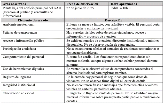 Se utilizó una ficha de observación para recopilar datos de primera mano sobre los fenómenos en estudio, registrando detalles específicos y relevantes de estilo organizado para facilitar el análisis posterior (Díaz, 2014). La ficha de observación hizo que el estudio absoluto se torne con más facilidad dentro de la cultura organizacional de la institución en los procesos relacionados a la honestidad y transparencia, permitiendo la creación de un plan de mejora eficiente que eleve la integridad pública y la rendición de cuentas en el GAD.