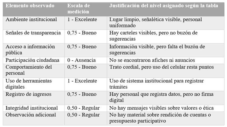 Para la evaluación de los elementos observados se utilizó una escala de medición con rangos de 0 a 1, en intervalos de 0,25. El valor 1 corresponde a un nivel Excelente, que indica un cumplimiento total y sin observaciones; 0,75 representa un nivel Bueno, con cumplimiento adecuado, pero con algunos aspectos por mejorar; 0,50 se considera Regular, ya que refleja un cumplimiento parcial con varias falencias; 0,25 indica un nivel Deficiente, es decir, una presencia muy limitada del elemento evaluado; y 0 representa una ausencia total del elemento o incumplimiento absoluto.