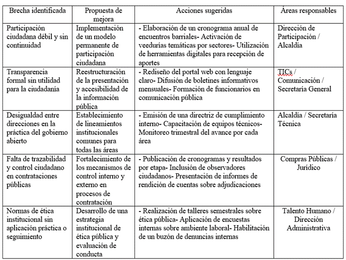 El plan de mejora elaborado se ajusta a las necesidades detectadas durante la investigación y se enfocó en resolver las principales falencias identificadas. Las acciones propuestas fueron socializadas con los equipos técnicos del GAD, y durante este proceso se logró recoger observaciones que permitieron afinar su viabilidad. La propuesta ha sido bien recibida, lo que constituye una base para avanzar en la institucionalización de prácticas más transparentes, participativas y éticas.